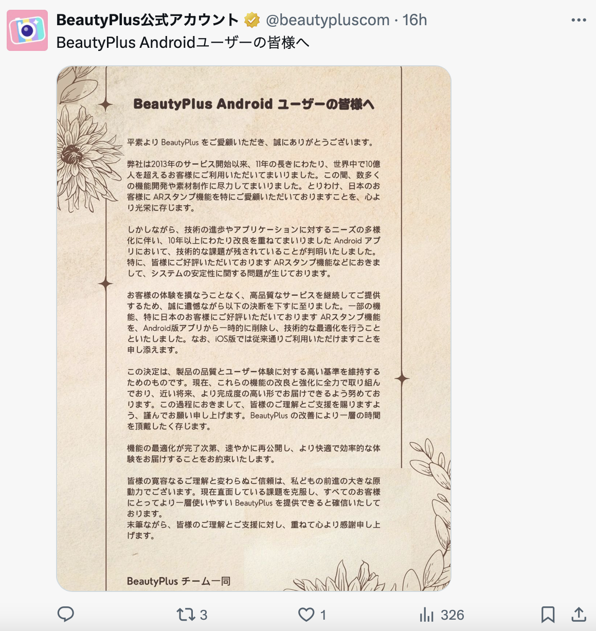 7月8日にビューティープラス(Beauty Plus)のX公式アカウントより、現在はiOS版でのみAR機能が使用できることが発表されました。